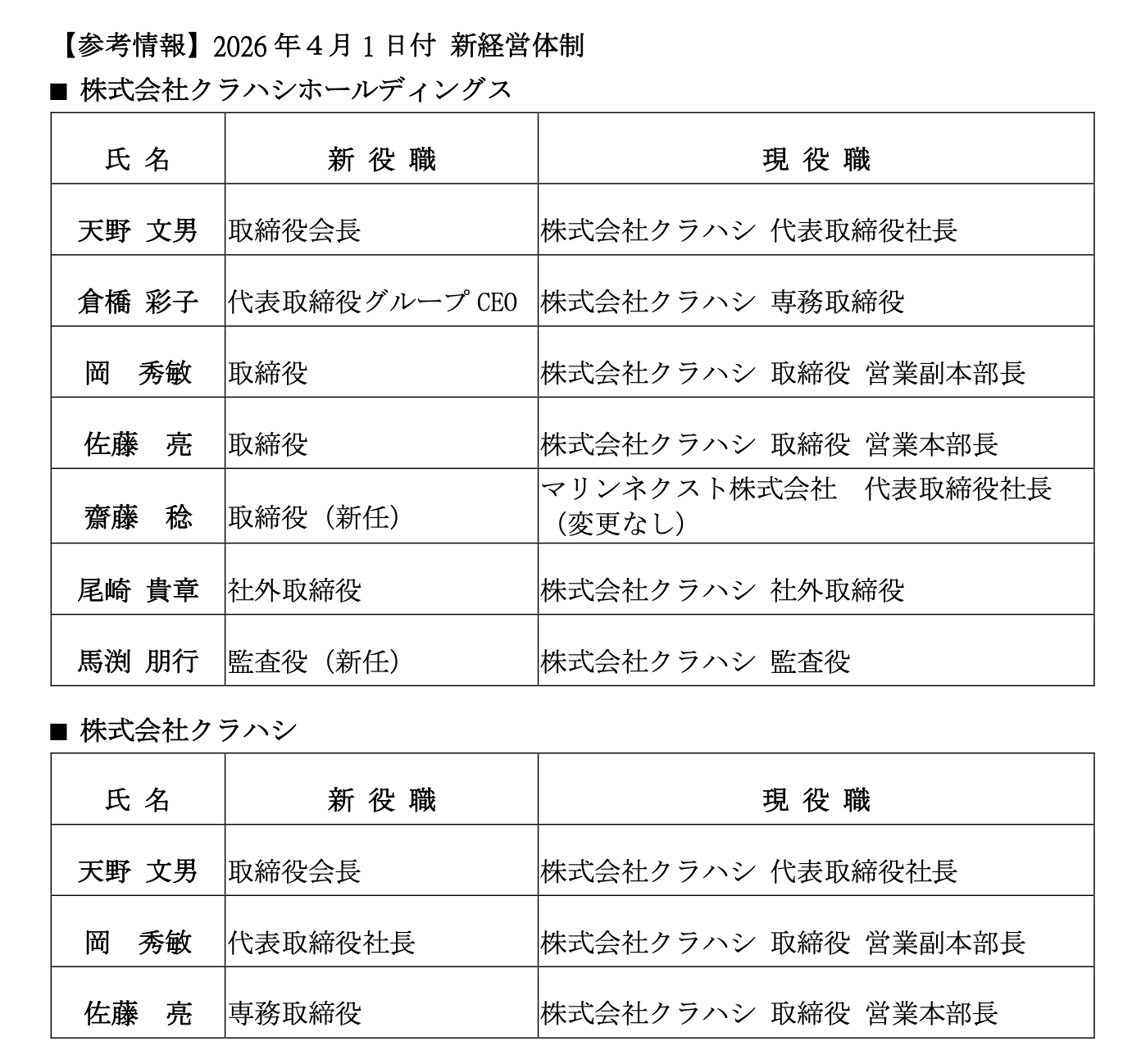 代表取締役 グループCEOには、倉橋 彩子(前 株式会社クラハシ 専務取締役)が就任いたします。 天野 文男(現 株式会社クラハシ 代表取締役社長)は、ホールディングスおよび事業会社の取締役会長に就任いたします。