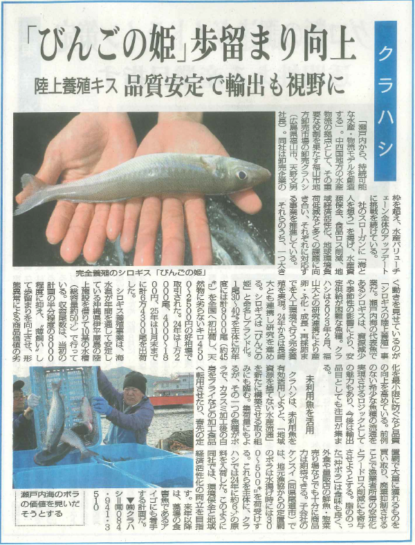 掲載:みなと新聞 クラハシ 陸上養殖キス「びんごの姫」歩留まり向上 品質安定で輸出も視野に『SDGs特集/各企業の取り組み』