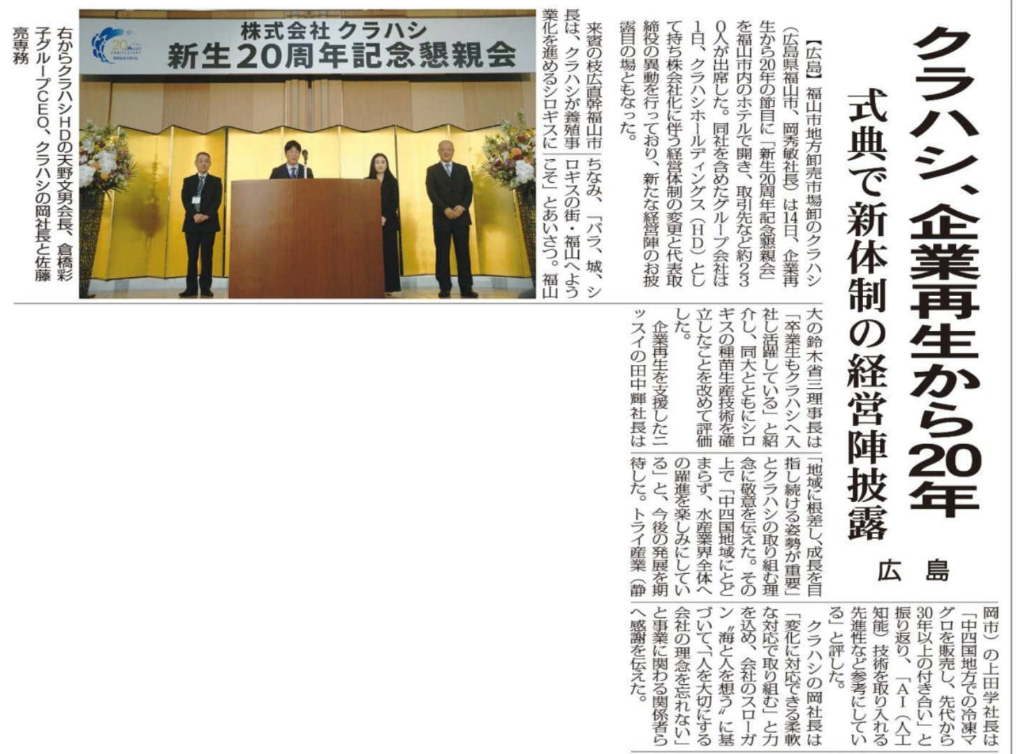 株式会社クラハシが企業再生から20周年を迎え開催した「新生20周年記念懇親会」の様子が、「みなと新聞」にて紹介されました。